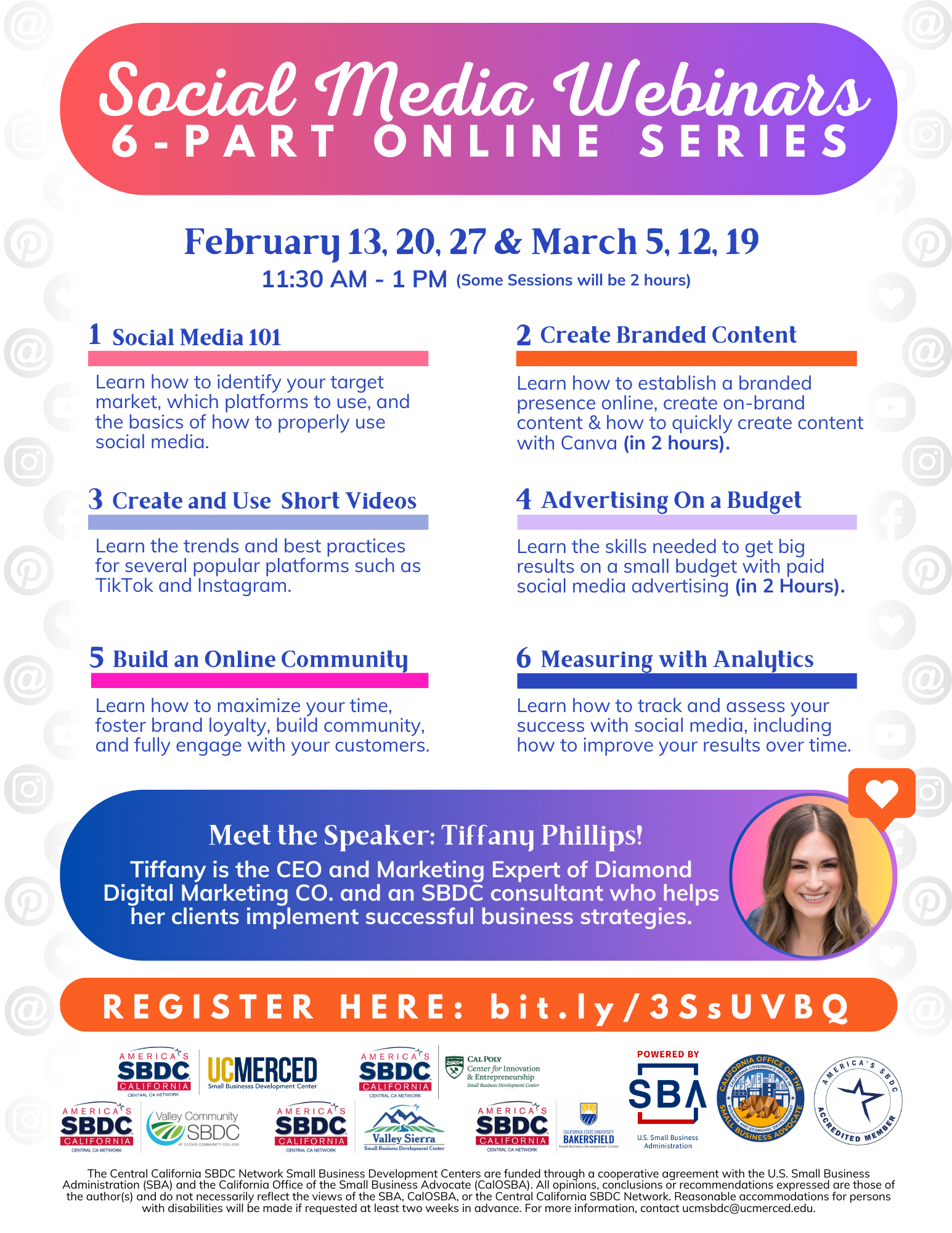 This series is brought to you by Central California SBDC and taught by SBDC advisor Tiffany Phillips! Tiffany is the CEO and Marketing Expert of Diamond Digital Marketing CO. and an SBDC consultant who helps her clients implement successful business strategies.
