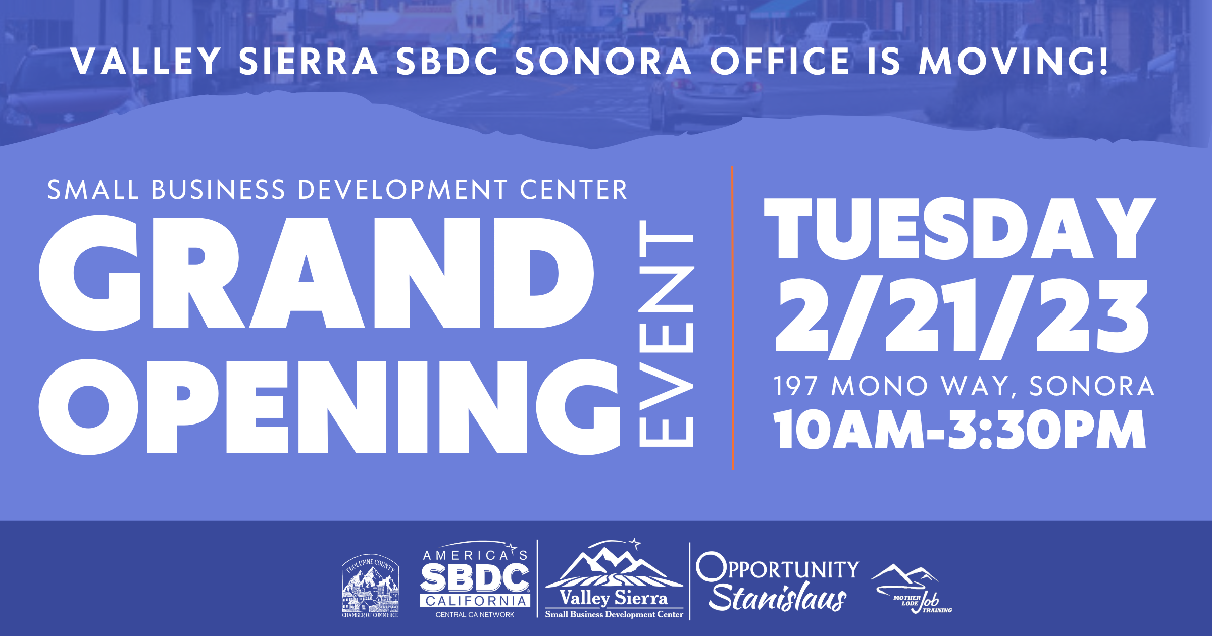 The Valley Sierra Small Business Development Center (SBDC) is relocating its Sonora office to the Mother Lode Job Training Center location! The Valley Sierra SBDC, Mother Lode Job Training Center, and Tuolumne Chamber will now be under one roof! We are excited to offer free resources to the local small business community to support their growth and future.