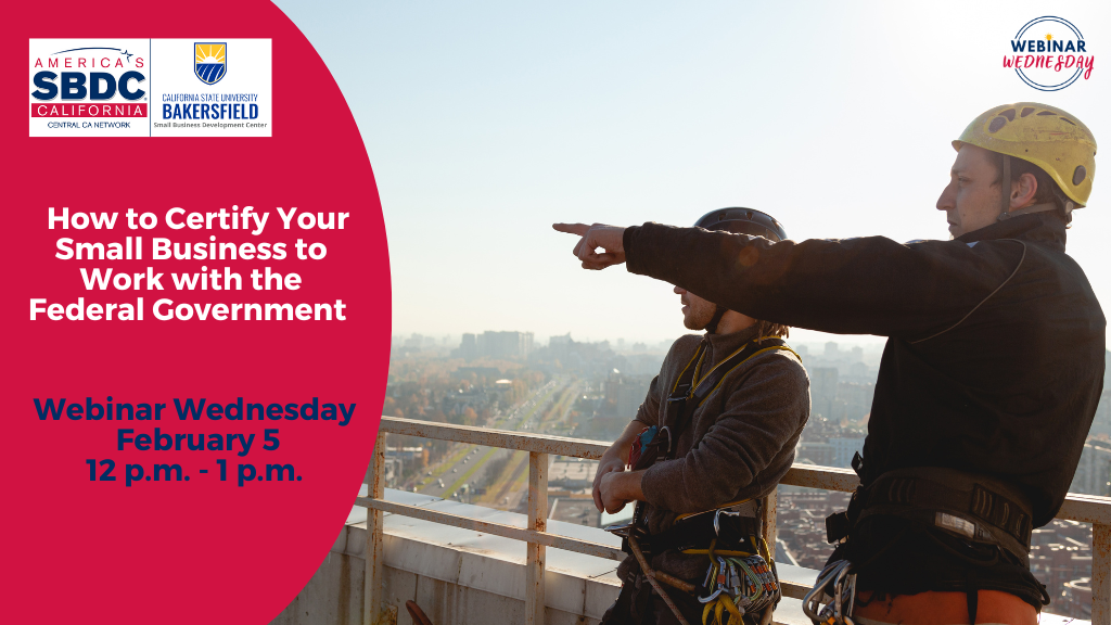 In this week’s free webinar, SBDC director Kelly Bearden will be joined by Joshua Howk, Business Opportunity Specialist with the U.S. Small Business Administration, Fresno District Office. Howk will discuss how the SBA works with federal agencies to award 23% of prime government contracts to certified small businesses, requirements for certification, and where to apply.