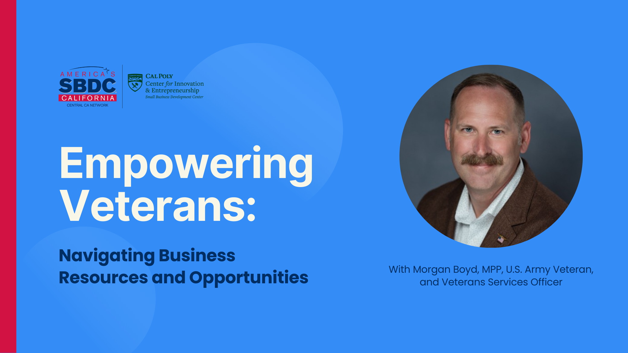 Join us for an insightful workshop tailored for veteran small business owners and entrepreneurs, featuring Morgan Boyd, MPP, U.S. Army Veteran, and Veterans Services Officer. As the Department Head at the County of San Luis Obispo, Morgan will guide you through the various resources available to support veteran-led businesses, including broader services for veterans such as health, education, and housing assistance. Learn about funding opportunities, mentorship programs, and strategic partnerships that can help you overcome common challenges and thrive in the local business community. Whether you’re just starting out or looking to grow your venture, this workshop will provide valuable guidance to help you navigate your entrepreneurial journey with confidence.