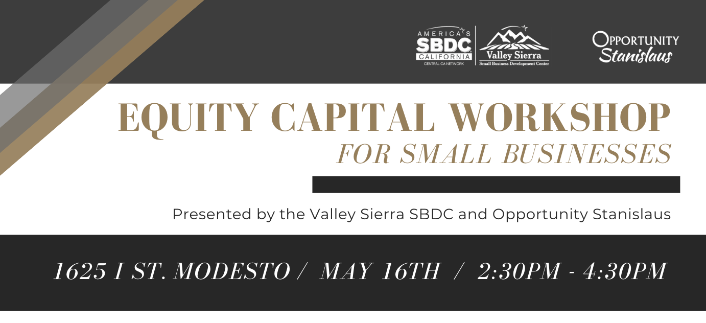 Join us for our Equity Capital workshop, presented by the Valley Sierra SBDC and Opportunity Stanislaus. This workshop will explore equity capital and verify if your business is a good fit for equity funding.