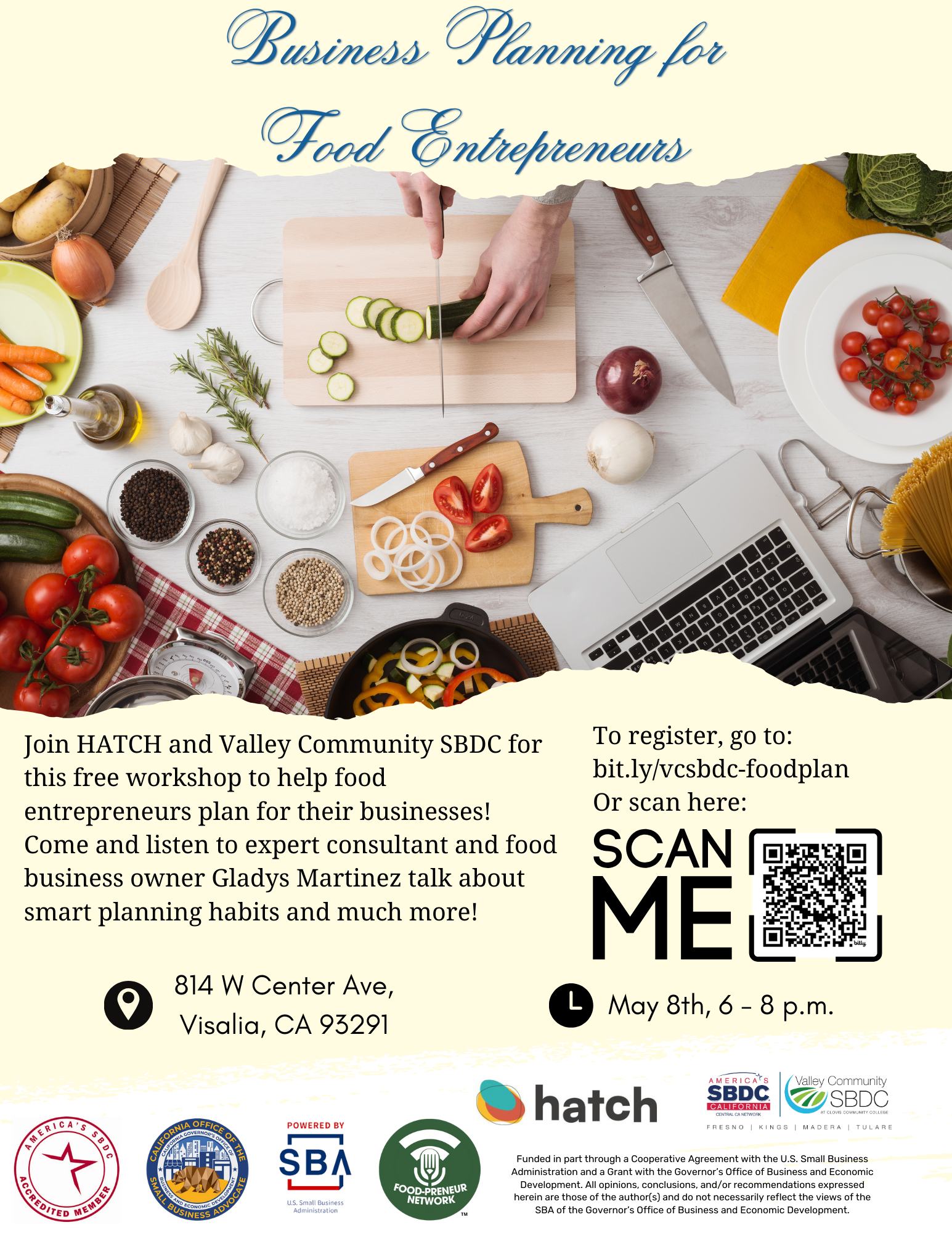 Join HATCH and Valley Community SBDC for this free workshop to help food entrepreneurs plan for their businesses! Come and listen to expert consultant and food business owner Gladys Martinez talk about smart planning habits and much more!