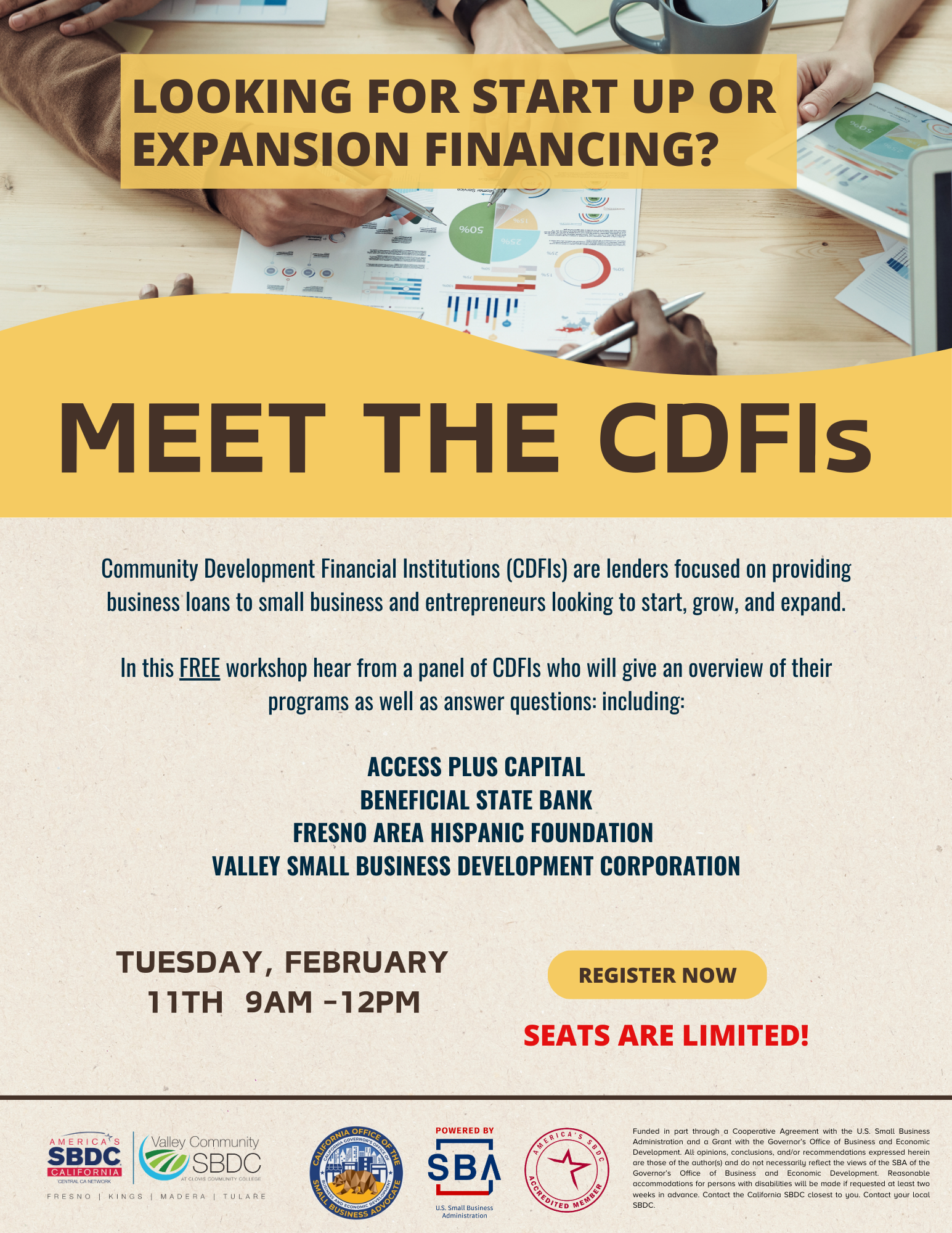 Community Development Financial Institutions (CDFIs) are lenders focused on providing business loans to small business and entrepreneurs looking to start, grow, and expand. In this FREE workshop hear from a panel of CDFIs who will give an overview of their programs as well as answer questions