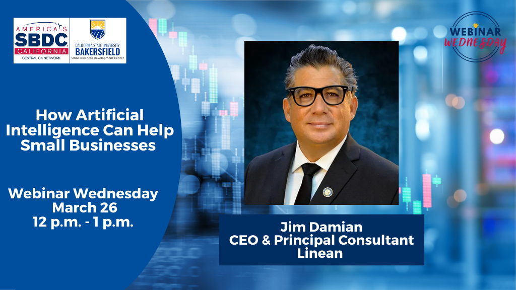 On this week’s free webinar, host and SBDC director, Kelly Bearden will be joined by Jim Damian, CEO & Principal Consultant at Linean, a new tech start-up that provides advisory services and artificial intelligence driven data solutions. Damian will discuss how AI can help businesses with cyber security, computer technology and software, as well as improve overall efficiency.
